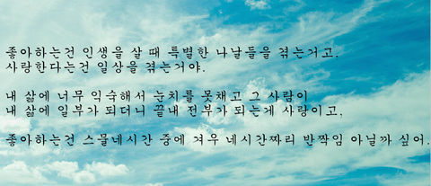 나는사랑을한다고 생각했는데 아직은 부족한 좋아함이구나 //앗....첫베플....(부끄부끄) 이 영광을ㅋㅋㅋㅋㅋㅋㅋㅋ새벽2시에 감성을 풍부하게 만들어준...우리마프와 마프1인의 이벤트남에게 바쳐요....(부끄부끄)