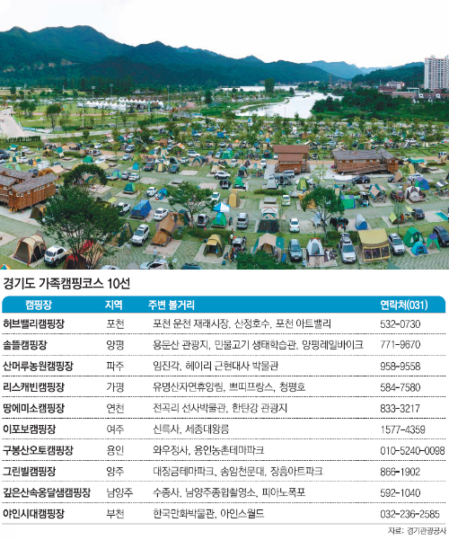 최근 가족 단위 캠핑이 각광을 받고 있는 가운데 수도권 도심에서 멀지 않은 경기도 내에도 자연과 캠핑의 맛을 흠뻑 느낄 수 있는 곳이 많다. 와이너리 투어와 시음을 하는 곳, 한강변 자전거를 탈 수 있는 곳, 유기농 체험을 하는 곳, 텐트를 빌려주는 곳 등등…. 멀리 갈 계획을 잡지 못했다면 이번 여름휴가에는 가족들이 만족할 만한 이색 캠핑장을 찾아보자.