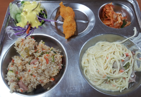 멕시칸샐러드(치킨너겟?), 볶음밥, 김치, 크림소스스파게티