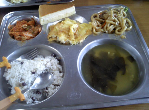 매콤볶음우동, 명태전, 검은콩밥, 김치, 미역국, ♥치즈케이크♥