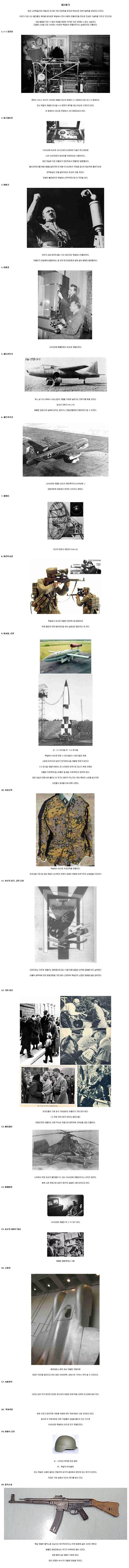6.제트폭격기 1945년에 개발된 최초의 제트폭격기(1945년에..) 연합국에게 제공권이 장악되 쓰이지는 못했다. 7.레이더 최초의 현대식 레이더 FuSe 62 8.야간투시경 독일에서 최초로 개발한 야간투시경 뱀파이르 뒤에 달린게 무려 배터리인걸 보아 실용성은 떨어지는 듯하다. 9.미사일, 로켓 상-v-1미사일 하-v-2미사일 독일에서 최초로 만든 v-1미사일과 v-2미사일은 후에 소련과 미국으로 넘어가 장거리미사일 개발에 모토가 되었고 v-2미사일 개발자 베르너 폰 노이만은 미국으로 건너가 후에 유명한 아폴로 프로젝트(암스트롱이 달 밟은 프로젝트)의 중역이 된다. 파리 공습의 대명사로 불리는 이 무기는 열차가 지나가는 듯한 특이한 소리를 일으키며 시민들의 공포를 더욱 증폭시킨다. 10.위장군복 독일에서 최초로 위장군복을 만들었다. 정규군을 가장 잘 갖춘 독일의 군사력은 전쟁의 세세한 부분에 이르기까지 섬세함을 드러냈다. 11.최초의 음주,금연 운동 이미지와는 다르게 히틀러는 결벽증이라 할수 있을 만큼 깔끔한 성격이 담배를 아주 싫어했다. 더불어 침략국에 한한 행동강령을 가장 많이 선포하여 독일군의 난잡한 행동을 일절 금하였다. 12.거리홍보 정치인들의 기본공식 거리홍보도 히틀러가 가장 먼저했다. (그 전에 카이사르가 했다는 말도 있음) 여담이지만 히틀러는 인류 역사상 처음으로 침략국에 고아원을 세운 인물이다.