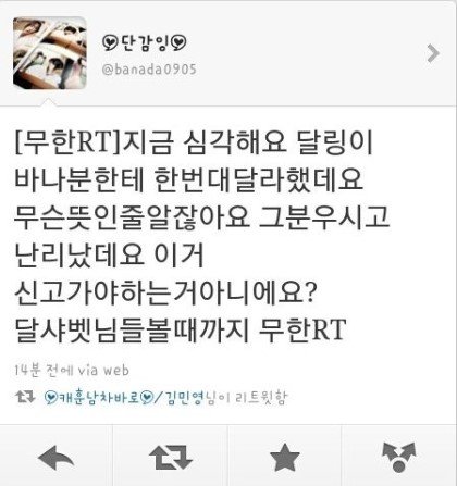 거기다 팔로워 팔로잉도 없는 상황에서 누구누구 사람 이름도 필터링 안 한데다 바나와 아육대라는 저 시점에서 자극적인 단어를 굳이 사용하고 22분에 글을 쓴 후에 14분 벌써 퍼졌나보네 쓴건 일부러 퍼지게 했다는 얘기 그러니까 우리 검색해서 빨리 달링 엿먹어주세요 라고 말하는 뜻이라고 볼 수 있음