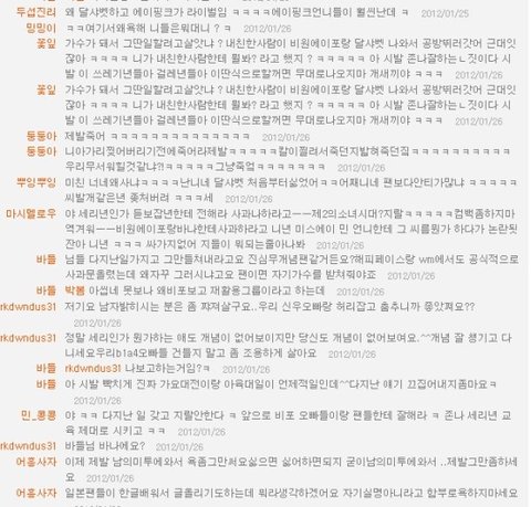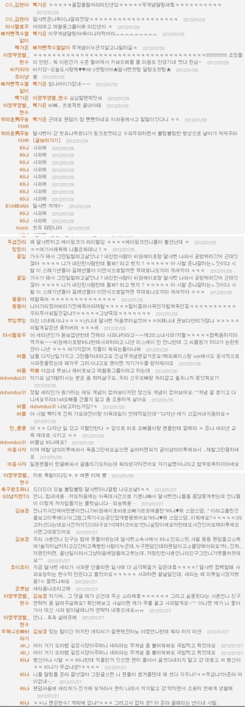 아육대사건 이후에 세리한테 단체로 유타로 욕보내고 다른 달샤벳 멤버들 미투데이에 단체로 욕댓글 달았던 바나들