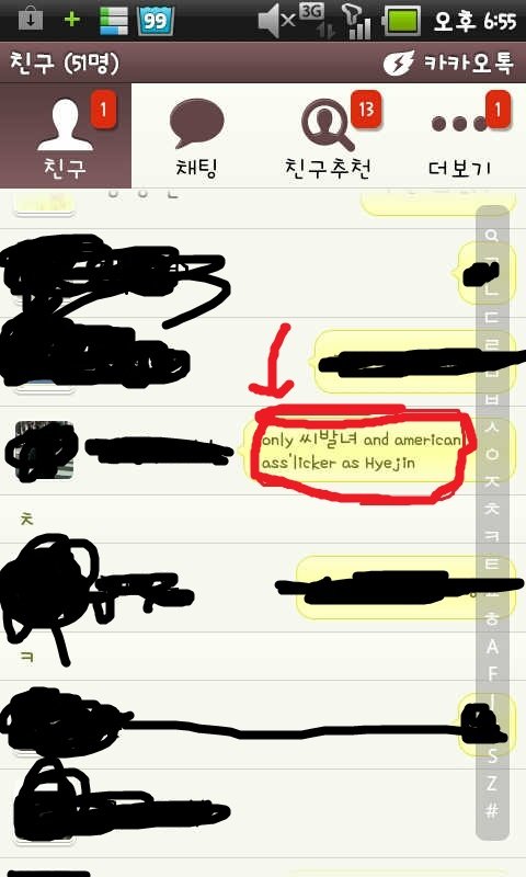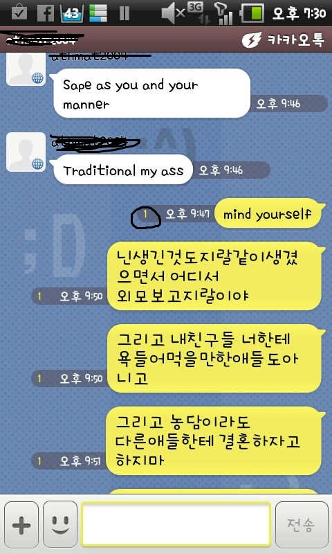 그리고 kiss 어쩌고 저쩌고 하길래 저는 전통적인 집에서 자랐다고. 신체적 접촉은 싫어한다고 분명히 못박아 놨습니다. kiss는 나중에 들어보니 cheek kiss 라더군요, 그래도 시꺼먼 남자랑 그러긴 꺼려져서 그런류에 대해서는 말도 하지 말라고 말했습니다. 안타깝게도 나중에 짜증나는 바람에 카톡에서 나가기를 터치하는 바람에 여기에 대한 말을 보여 드릴 순 없지만. 그 개갴키... 한국 여자들은 sex에 대해서 거북해하지만 american movie with full of sex (섹스로 가득 찬 미국 영화)는 좋아한다고 하더군요. 미친놈.