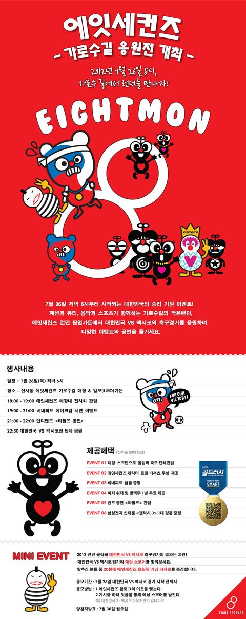 글로벌 SPA 브랜드 에잇세컨즈에서 2012년 런던 올림픽을 맞이하여 올림픽 캐릭터 전시회 '8seconds London Pop-Up Garden'와 '가로수길 응원전'을 개최한다.