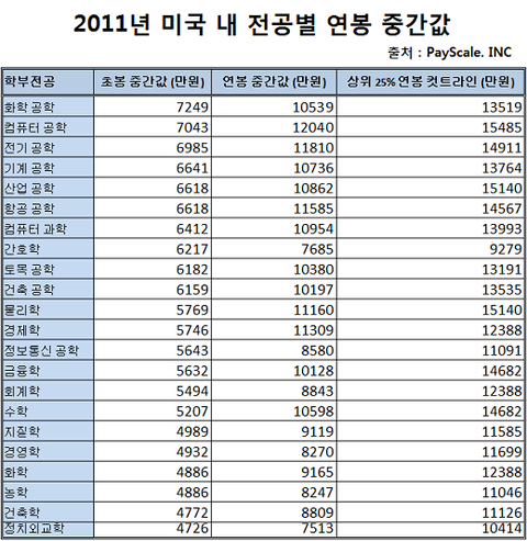 자기 전공에 따라 받는 초봉이랑 연봉임.