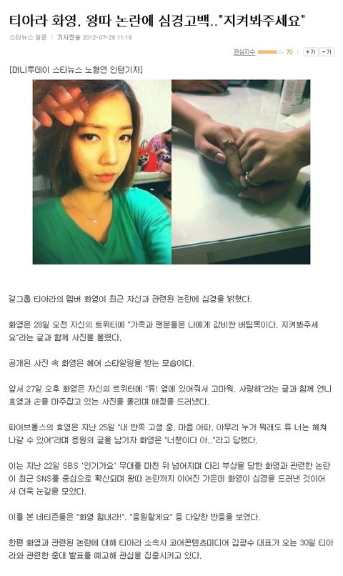 5. 위에 글에서 화영은 남자아이돌하고 있으면 욕먹을것을 각오했을거임. 그런데도 불구하고 같이 있음. 그러니까 화영은 티아라 멤버들하고 같이 있는거보다 다른그룹하고 같이 있는게 낫다고 생각했을거임.