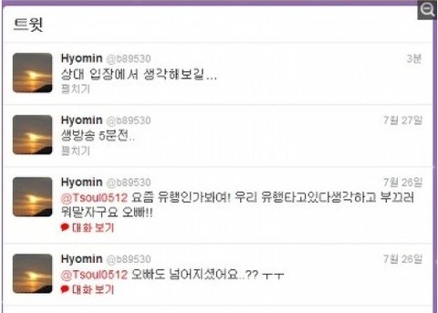 김광수 대표가 직접 작성한 것으로 알려진 이 보도자료에서 화영의 계약해지 이유에 대해 “티아라는 8명의 개인 보다는 팀워크를 더 중요시 하고 있다”며 “돌풀행동이 문제일 뿐 불거진 왕따설이나 불화설과는 무관하다”고 전했다. (사진출처: bntDB / 효민 트위터)