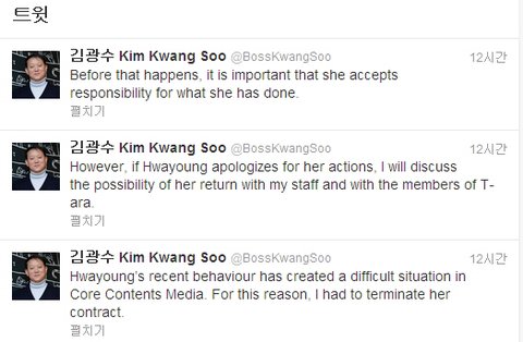 지난 30일 오후 김광수 대표는 자신의 트위터에 “If Hwayoung apologizes for her actions, I will discuss the possibility of her return with my staff and with the members of T-ara (화영이 자신의 행동에 관해 용서를 구한다면, 나는 티아라 멤버들과 스태프와 함께 화영의 티아라 복귀를 논의하겠다”고 입장을 밝혔다.