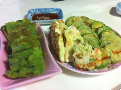 부추갈아 넣어서 반죽한 부추전이랑 호박전~계란말이까징.