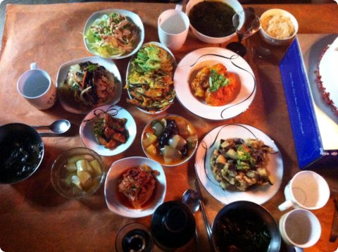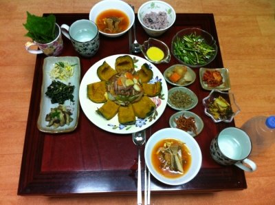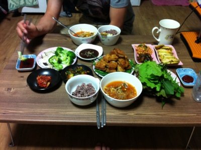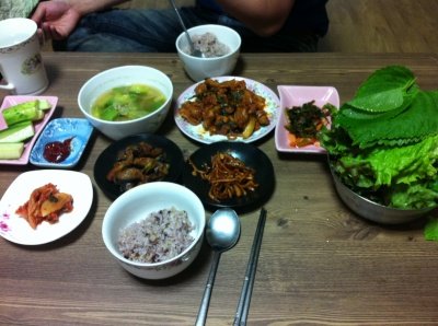 된장찌개.제육볶음.파김치.가지나물.진미채볶음.상추쌈 차림