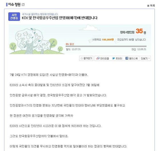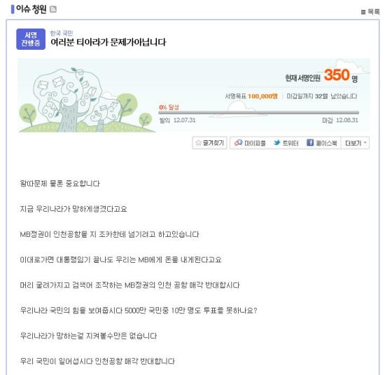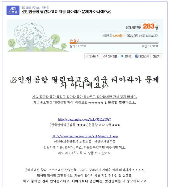인천공항 매각 반대 아고라 서명운동 http://bbs3.agora.media.daum.net/gaia/do/petition/read?bbsId=P001&articleId=125115 다음 아고라 광장 서명게시판이에요♡ 서명에잠깐 5분투자하고 티아라기사가서 화영이 응원해도 늦지않아요!! 티아라랑 광수욕은언제든할수있고이미많은사람이하고있지만요 인천공항은 지금밖에시간이 없어요ㅠㅠ 오늘이면 어떻게될지 몰라요ㅜㅜ 제발부탁드려요ㅜㅜㅜ