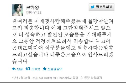 한편 화영은 7월31일 자신의 트위터를 통해 "팬 여러분 이제껏 사랑해주셨는데 실망만 안겨 드려 죄송하다. 이제 그만 멈춰 주시고, 앞으로 더 성숙하고 발전된 모습들을 기대해달라. 그동안 걱정 끼쳐드려서 죄송하다. 코어콘텐츠미디어(소속사) 식구분들께도 죄송하다는 말씀 드리고 싶다. 더 좋은 모습으로 인사드리겠다"고 글을 올렸다.