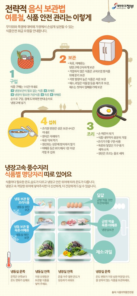 그럼 대한민국정부의 펀통이가 전하는 한눈에 보는 인포그래픽스로"음식 보관법과 냉장고 정리로 여름철 식품 안전을 대처하는 자세!!"를 소개하겠습니다.