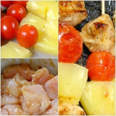 더욱 상큼하게 입맛을 돋구어 주어 닭꼬치의 맛을 2배로 살려준답니다! 4. 꼬치에 닭가슴살과 파인애플, 토마토를 번갈아 끼워줍니다.
