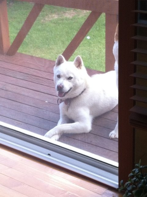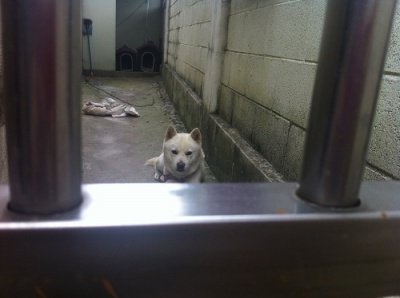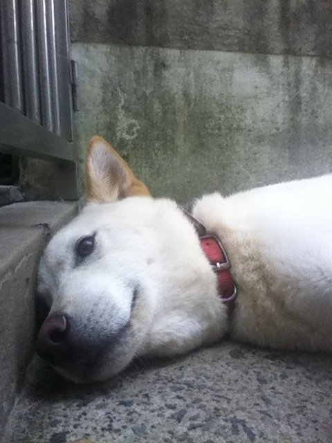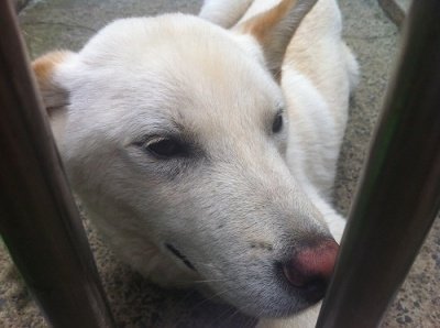 두비가 철창너머 누워있음. ㅋㅋ얼굴만찍어서 이렇게 누워있는것같은데