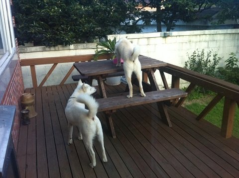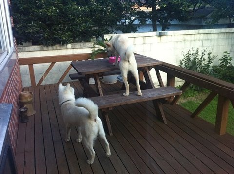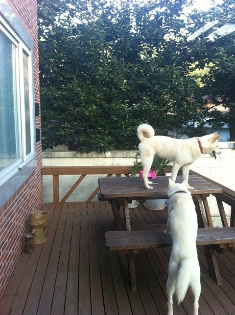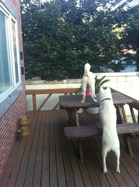 개들 밥 주고나서 사료그릇을 저렇게 테라스 벤치위에 올려놓았음.