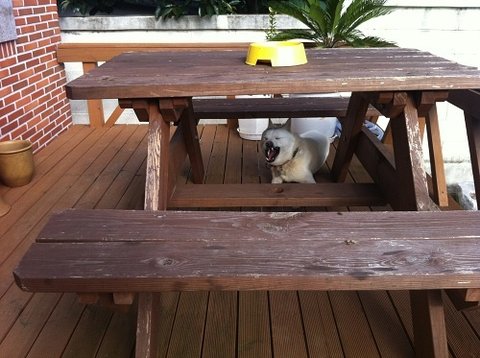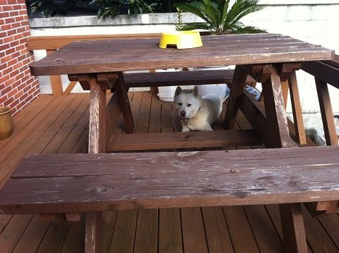 날이 더우니 테라스에 있는 벤치테이블 밑에 그늘에서
