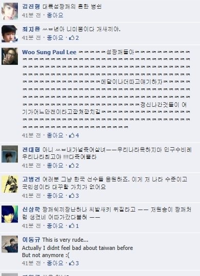 대만은 한국 이번에 올림픽 중에서 깨끗하게 경기한거 있냐, 더러운 플레이 이딴 말 하고있고요