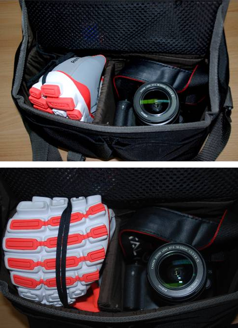 호기심 발동한 저! 한번 넣어 본 김에 끝까지 한번 넣어보자는 의지로 제가 애용하는 카메라 가방 한 켠에도 넣어보았습니다!카메라 부품넣는 공간이라 그닥 넓지 않은데도 돌돌 말아 넣으니 여기에도 들어가네요~대박… 어디 멀리갈 때 운동화 요렇게 넣어가면 좋을 것 같아요!