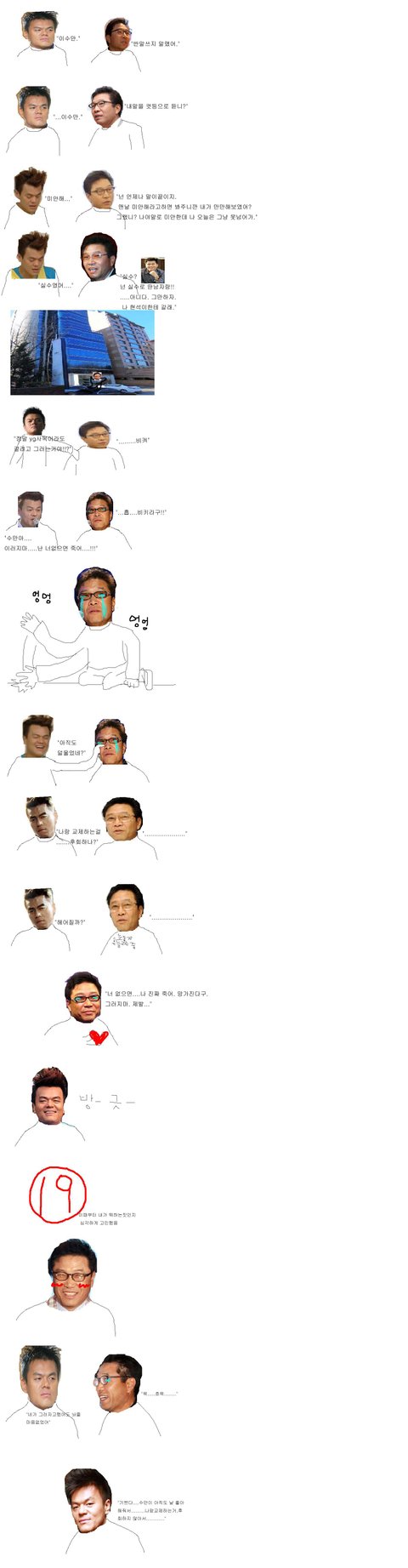 진영의 간절한 말에도 불구하고 수만은 냉정하기만 했다. 오늘은 절대 넘어가지않을꺼야. 두고봐. 수만은 그렇게 되뇌이고서는 sm사옥을 발빠르게 빠져나갔다. 하지만 가만히 보고만있을 진영이 아니였다. 진영은 금세 수만을 뒤쫓아갔다.