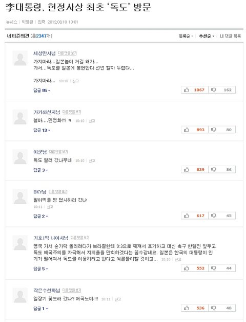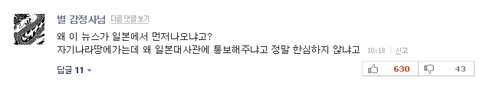 + 다음 베플......(이명박 대통령은 일본 기사에서 보다시피 먼저 통보한 적이 없습니다. 일본의 정보통이 정보를 입수했을 뿐 ㅡㅡ 아울러 대통령 일정은 일부를 제외하고 극비인거 모르는가? 그래서 우리나라 언론에 안 알린거지ㅠㅠ 추천수 보세요... 역시 선동 좌음...)
