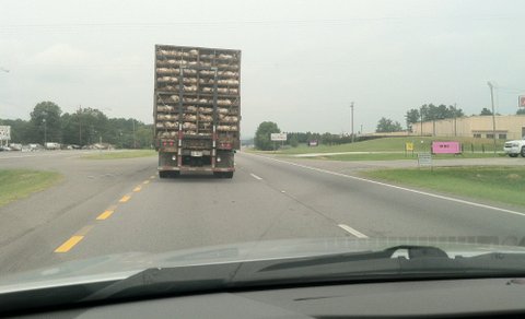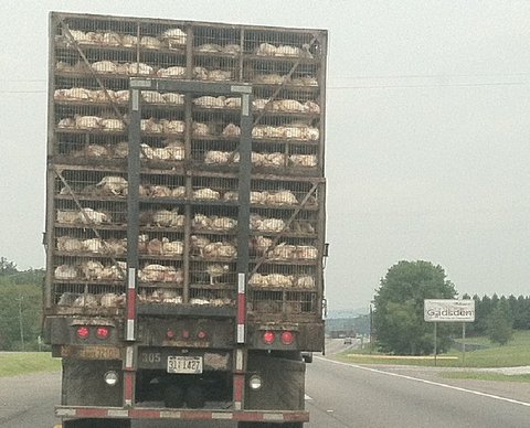 네, 닭입니다. 도축장으로 닭을 옮기고 있더군요.