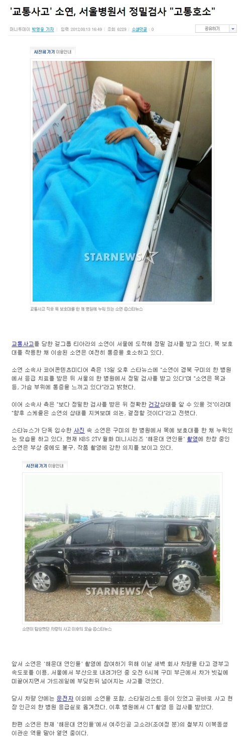 앞서 소연은 '해운대 연인들' 촬영에 참여하기 위해 이날 새벽 회사 차량을 타고 경부고속도로를 이용, 서울에서 부산으로 내려가던 중 오전 6시께 구미 부근에서 차가 빗길에 미끌어지면서 가드레일에 부딪힌뒤 넘어지는 사고를 겪었다.