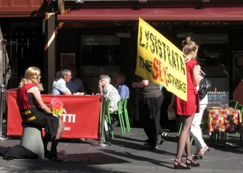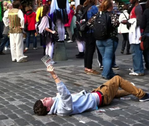 공연 홍보하시는 건데 누워서 전단지 가져가라고 하는 거에요