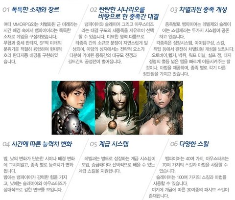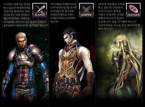 다른 rpg온라인게임과는 독특한 뱀파이어, 슬레이어, 아우스터즈라는 소재로 구성되어있는게임입니다.