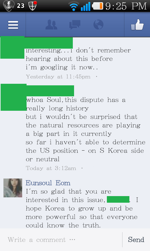 일본인: 안녕!독도의 불확실한 문제에 대해서 정보가 부족했어서, 어젯밤에 독도 문제에 대해서 많은 것들을 읽어봤어.너가 올린 글에 내가 기분 상하게 하는 말들을 했다면 미안해.내가 TV 뉴스로 보고 들었던 것들을 바탕으로 말한 잘못된 진술에 대해서는 잘못 됐음을 인정해.(그래서 아마도 난 일본인들이 TV를 통해 얻은 정보를 믿는 것에 대해서는 탓하지 않을것 같아.)어쨌든, 한국인들의 긍지를 짓밟을 의도는 아니였어.난 한국이랑 일본 둘 다 좋아해.한국에 몇 번 가본적 있는데, 한국의 장소들, 음식들, 사람들, 그리고 지방 지역들이 정말 좋았어.독도 문제로 돌아가면, 내 포인트는 그들은 이 문제를 평화적으로 해결해야 한다는 것이야.(업신 여기면서 입증하는 건 다른 사람들의 직업과 경제에도 영향을 미쳐.)아니면, 한명의 선입견 없는 결정권자를 찾으면 일본과 한국이 독도 문제를 해결하는데 도움이 되겠지.미국은 명백하게 일본과 한국 사이에 간섭하고 싶어하지 않아go.몇몇 전문가들은 미국이 독도 문제의 장본인 이라고 말해.60년 전에 독도를 불확실하게 남겨놓았다는 반박의 여지가 없는 사건 때문이지.