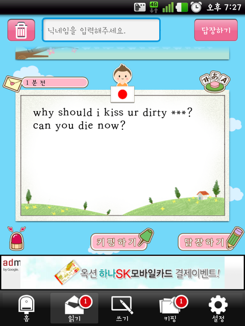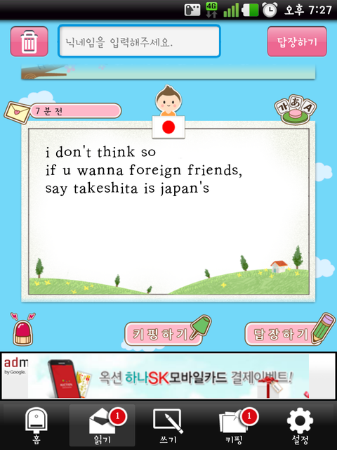 제가 7시 30분 경 두근두근 우체통에서 메세지가 하나 왔길래 봤습니다.