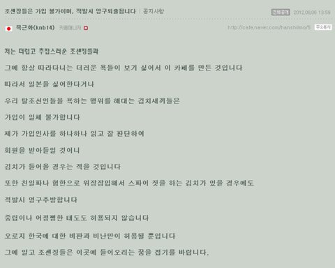 대문에 떡하니 한국을 싫어하는 카페라고 조센징이라고 대한민국 사람을 싸잡아 비판하는 거 아니겠음ㅡㅡ