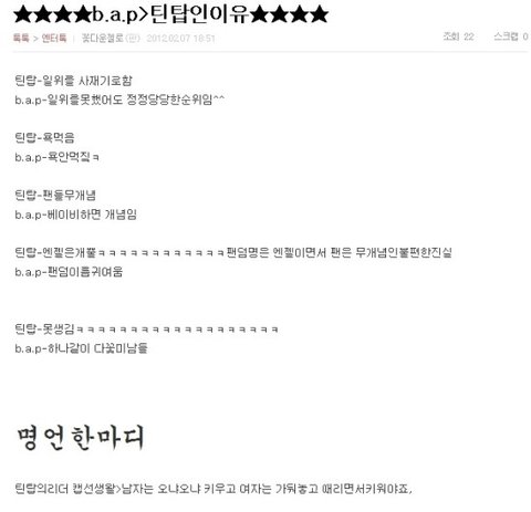 다른 그룹들하고 B.A.P>틴탑,B.A.P>인피니트 ,B.A.P>비원에이포 이런짓들만 하고 진짜...