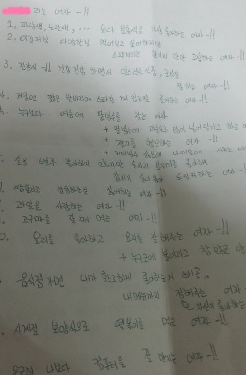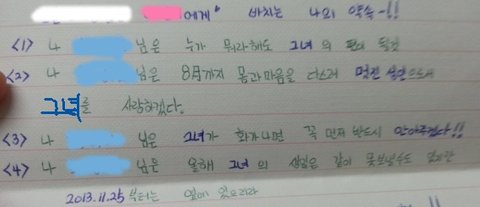 드라마 많이 보지 말고, 밤늦게 돌아다니지 말고, 술 많이 먹지 말고(ㅋㅋㅋ?????응???), 외간 남자와 쉽게 어울리지 말고, 식사는 꼭 밥으로 먹고, 영어공부 열심히하고, 아침 일찍일어나고, 항상 웃고 울지말고, 부모님께 잘하고, 자기는 잊지 말고 매일매일 생각하고, 편식하면 안되고, 카페보다는 책방에 가고, 추울때는 멋부리지 말고 따듯하게 하고 댕기고, 여름에도 꽁꽁 싸매고댕기고(?????????ㅋㅋㅋㅋㅋㅋㅋㅋㅋ)