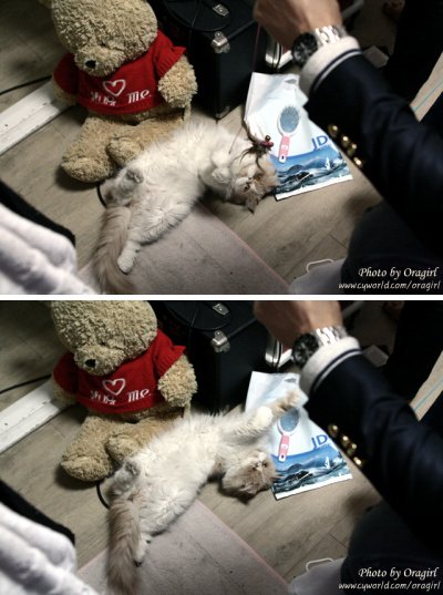 친구가 낚시줄로 놀아주자 온갖 끼를 부리며 놀고있음.