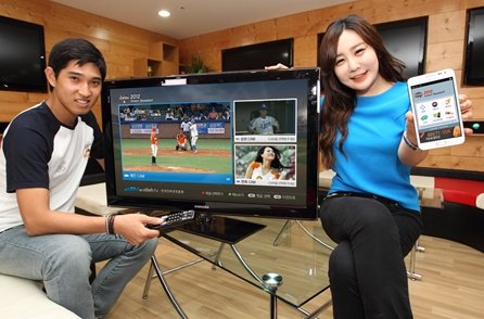 KT에서 제공하는 스마트폰 연동서비스는 스마트폰에서 ‘스마트야구’ 애플리케이션을 활용하면 TV화면조작을 리모콘이 아닌 스마트폰 버튼으로 할 수 있으며, ‘리얼타임 데이터’메뉴를 이용하면 경기상황과 관련된 각종 데이터를 검색할 수 있도록 했는데요