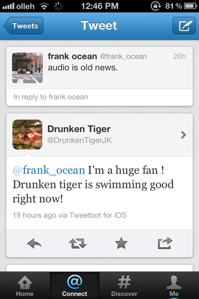 타이거JK 가 프랭크 오션에게 엄청난 팬이라고 트윗을 보냈네요!! ㅋㅋ