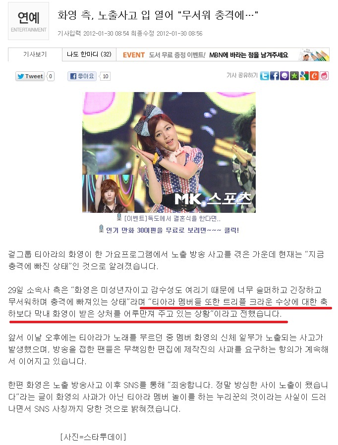 한편 현재 티아라는 ‘왕따·불화설’ 이후 화영이 소속사 측에 사과한 후 진정 국면에 들어서는 것이 아니냐는 추측 속에 활동을 전면 중단한 상태다.