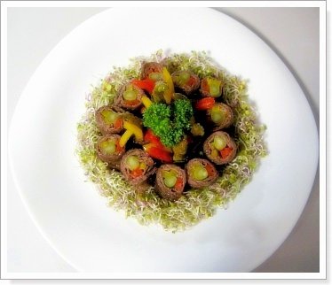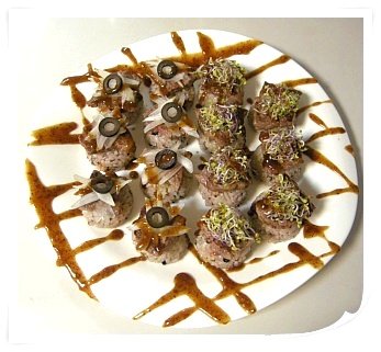 스테이크 한 점씩 올리고, 양파&올리브 / 새싹 올린 럭셔리 초밥ㅋㅋ