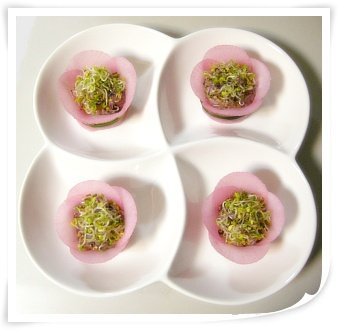 백년초 가루 살짝 넣어 곱게 물들인 예쁜 무쌈말이 새싹 꽃초밥 ![]()