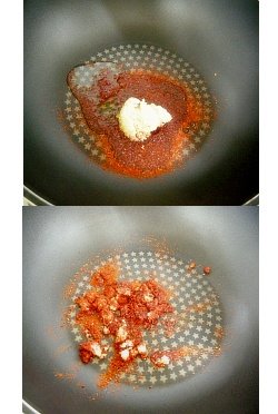 2. 먼저 공통양념인 고춧가루, 식용유, 다진마늘을 볶아줍니다. (타지 않게 30초 정도)
