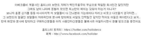 아베나 홀리는 모델도 백인만 씁니다. 반면에 폴로 같은 브랜드의 미국 홈페이지 들어가보시면 모델로 황인 백인 흑인고르게 나오죠. 사장이 오프라 윈프리쇼에서 인종차별적인 발언을 하고, 직원들도 거의 백인들만 뽑습니다. 아시아권 인종들을 비하하는 디자인의 셔츠 를 만들었다 소송도 걸리고 불매운동도 하니 아예 쌀밥에 파리가 붙어있는 티셔츠도 출시는등 아주 저질스런 기업이죠. 원래 클리어런스 기간에는 미국주소, 미국카드, 미국ip로만 주문 가능하도록 막혀있었는데 최근에 미국내 매출이 반토막 나서 주가가 폭락하니까 가끔 해외배송도 하는등 돈 앞에서는 약해지는 이중적인 모습도 보입니다. 하여간 사장부터 시작해서 모델들까지 딱 그 수준인듯