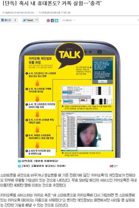 카카오톡을 서비스하는 카카오 측은 “새 스마트폰으로 카카오톡에 다시 가입하면 옛 스마트폰에 있는 카카오톡 데이터는 자동으로 삭제된다”고 했지만 개인정보는 화면에서만 사라질 뿐 실제로는 간단한 기술로 빼낼 수 있는 것으로 드러났다.