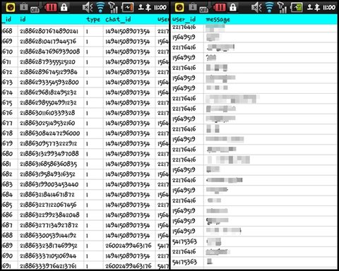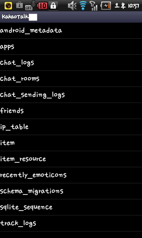 그 어플을 이용하면 곧바로 카카오톡 데이타베이스 파일에 들어갈수 있었는데요, 보이는 저것들이 그 파일 안에있는 목록들입니다. 다시말하지만 카카오톡에서 로그아웃 해서 메시지를 보낼수도 없고 어플로보면 아무것도 남아있지 않았었지만 이렇게 버젓이 정보들이 남아있었습니다...