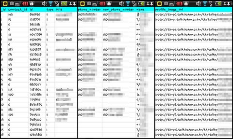 이번엔 friends에 들어왔는데요, 친구들 리스트와 대화명, 전화번호와 심지어 카카오톡 프로필 사진의 인터넷 주소까지 있었습니다.(저 주소를 복사해서 인터넷 주소창에 붙여넣으신후 접속하시면 곧바로 친구의 프로필 사진이 뜹니다..)