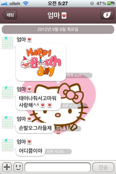 내생일날 엄마가 카톡으로 태어나줘서고맙다고햇는데