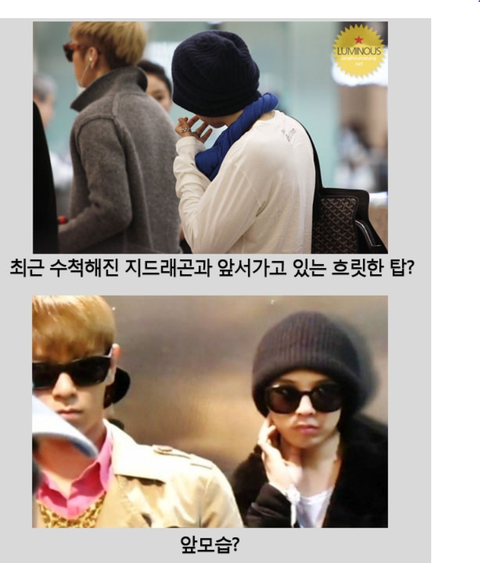 ㅋㅋㅋㅋ댓글봐라 진짜 우리가 한두번 옷따라 입었다고 이렇게 하겠냐구요 ㅋㅋㅋㅋ 인터넷에 권지용 용준형 쳐보세요 한두번은 몰라도 같은옷입고 비슷한 스타일인게 한두번인지ㅋㅋ 백번 양보해서 그래, 그 수많은 반지와 옷들 협찬일수도 있고 어쩔수없이 겹쳤다고 합시닼ㅋㅋ 스타일까지 똑같아서 팬조차도 착각하는건 쫌 아니라고 생각되지않나요? 우기는 몇몇 뷰티분들? 난 이게 젤어이없더라 ㅋㅋ 팬이 봐도 난 진짜 권지용이랑 탑인줄 알았음ㅋㅋㅋㅋㅋ