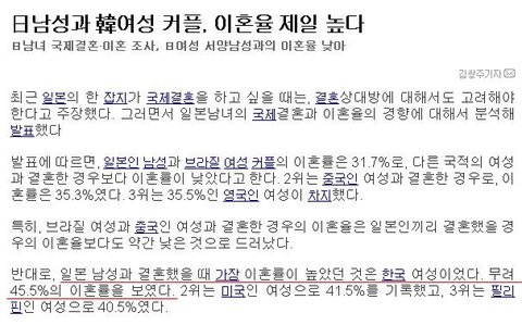 저거보고 한국여성만 탓할일이 아닙니다 실제로 일본여성들 보면 확실히 보수적인 일본남자들 덕분인지 여자들이 기가 많이 죽어있습니다 덕분에 일본여성들 보면 얌전하게 보이죠 전통적으로 일본은 가부장적이고 현실진행형입니다 물론 이 말에 일본AV보고 난잡하던데? 이럴 사람 있을거라 봅니다 그러나 그런애들보다 가부장적인 사회에 억눌려 얌전한 여성이 많습니다 그러다보니 한국남자들이 일본여성 선호하는 측면도 있습니다 왜냐면 그런 일본여성과 한국여성을 비교하면 단연 일본여성이 편하거든요 한국여성은 양성평등이 워낙 빠르게 진행되다보니 교육수준도 그렇고, 좀 드센면이 있는게 사실이거든요 일본여성에 익숙해져있는 일본남자가 볼때 한국여자는 감당하기 힘듭니다 한국남자들이야 그러려니 하지만, 가부장적인 일본남자들에게는 감당하기 힘든 일이거든요 그래서 저런 결과가 나온겁니다. 한국여자만 탓할일이 아닙니다 일본과 한국의 양성평등의 수준차이로 인한 겁니다 괜히 한국여자가 드세서 이혼했다고 생각하지마세요 일본남자에게 한국여성은 맞지 않는것 뿐입니다