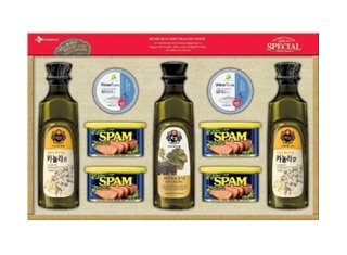 ‘CJ특선선물세트 A호’! 스팸이랑 워터튜나 요리용 살코기랑 카놀라유, 포도씨유가 들어 있더라구여.